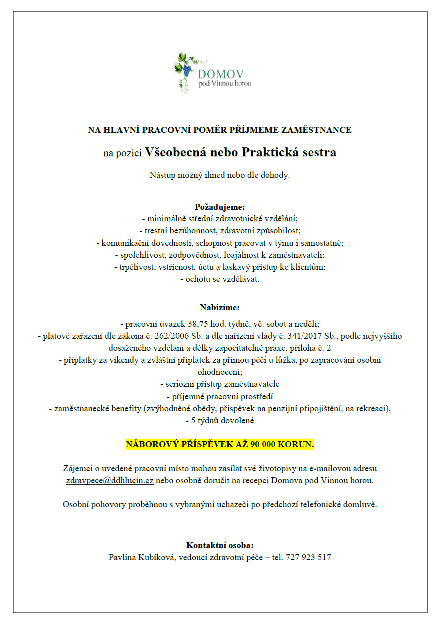 Zájemci o uvedené pracovní místo mohou zasílat své životopisy na e-mailovou adresu zdravpece@ddhlucin.cz nebo osobně doručit na recepci Domova pod Vinnou horou.